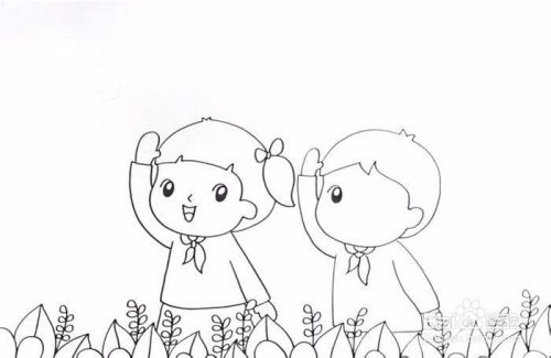 先在底部画一排花花草草,然后画两个正在敬礼的小朋友。