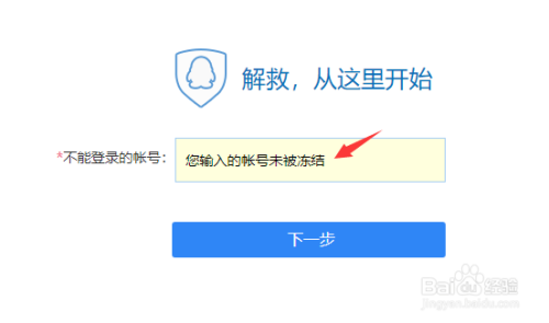 在输入框中,输入自己待解封的qq账号,如该账号系统检测并未封禁,则会提示;如该账号确已封禁,则可点击“下一步”。