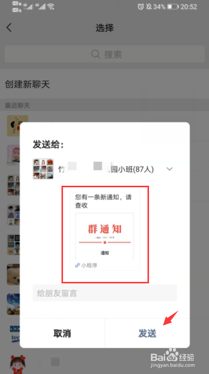 之后,选择一个微信群,点击发送,这样群里每个人都会看到,就等于@群里每个人。
