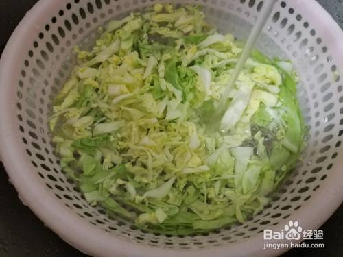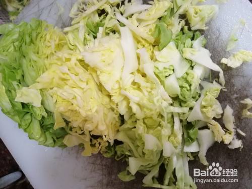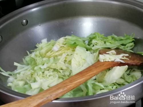 卷心菜先下锅,中火翻炒,加入少许的水和盐
