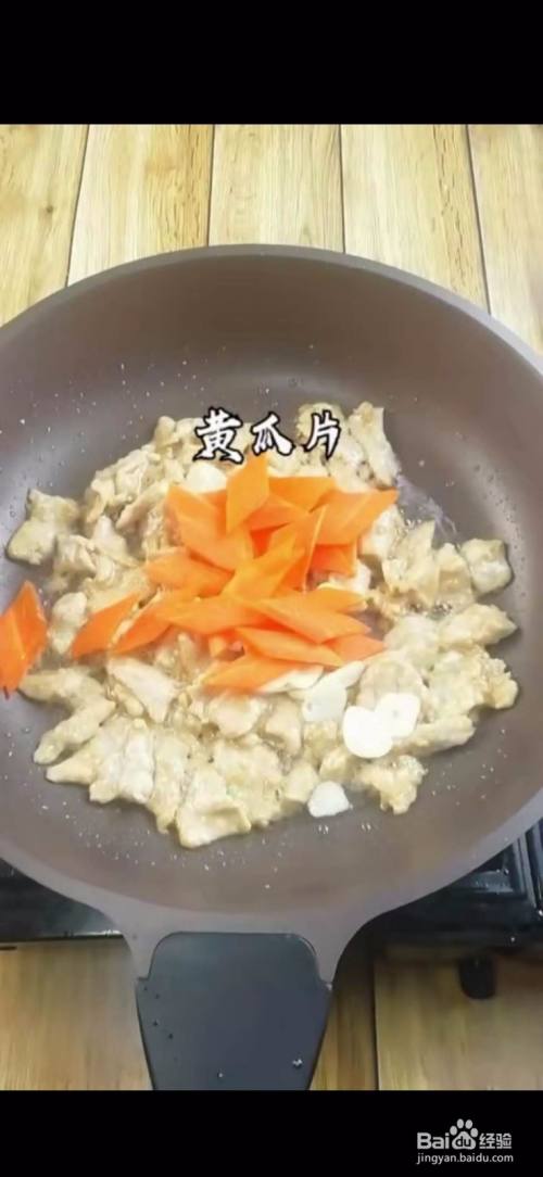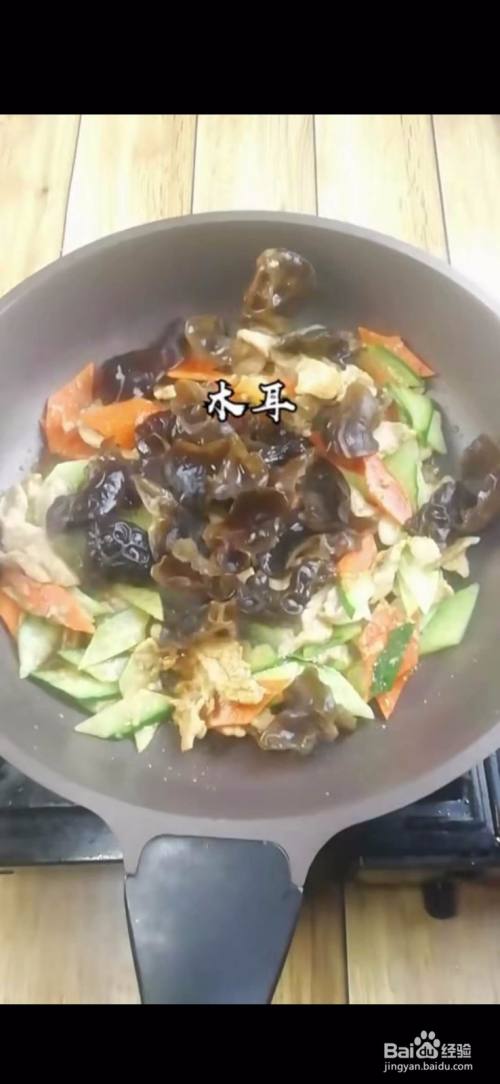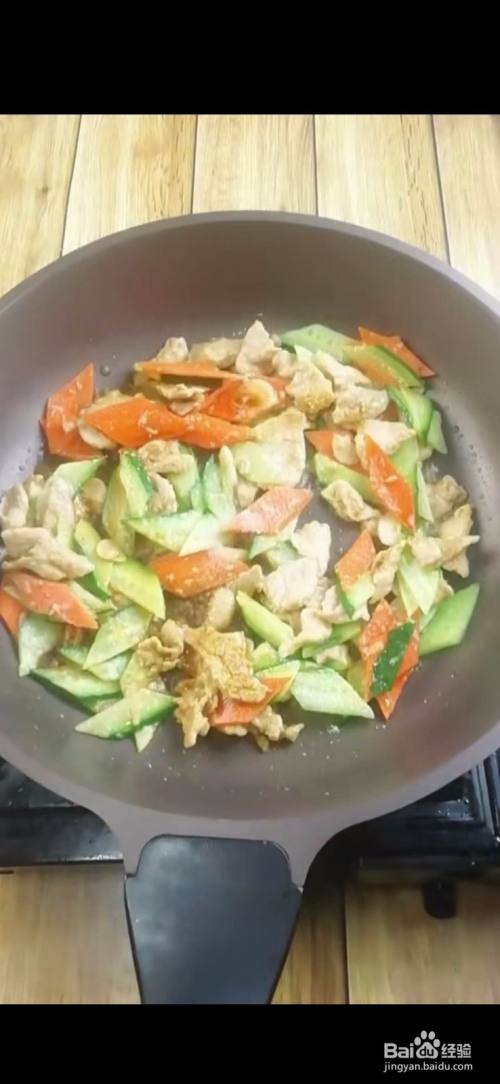 倒入肉片翻炒,加入大蒜,木耳和胡萝卜,还有青瓜