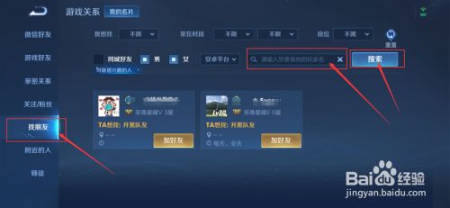 在左侧点击【找朋友】选项,然后输入游戏昵称,点击【搜索】。