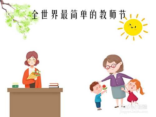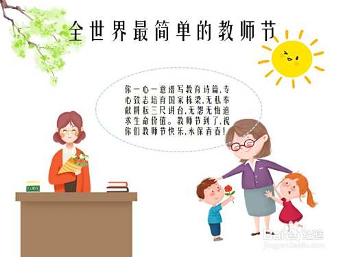 在右下角画两个学生送鲜花给老师,并祝老师教师节快乐,用来呼应主题。