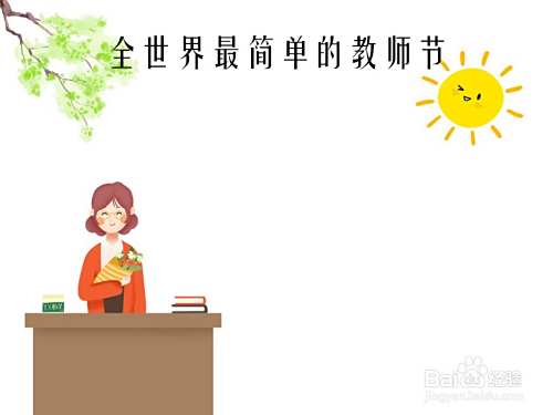 在左下角画一位和蔼可亲的老师手捧着鲜花,她站在讲台前微笑,用来烘托气氛。