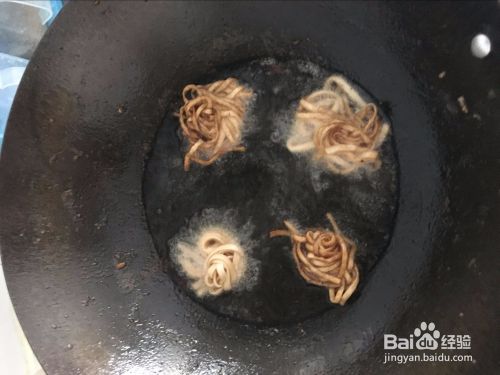 将锅烧热,倒入适量的油烧至五成热,放入卷好的面条团子,翻炸每一面至金黄色