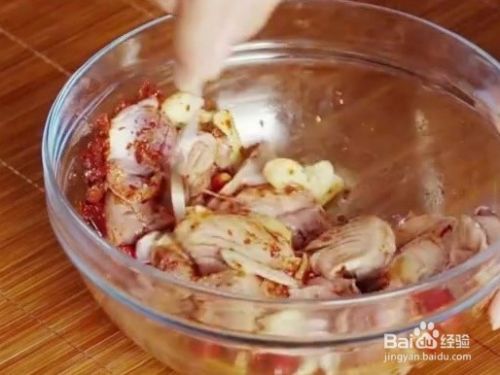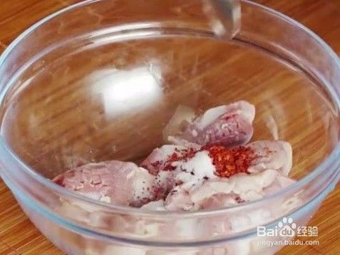 鸡胗倒入碗中,加一勺盐、两勺辣椒粉、一勺白糖、少量姜蒜片、一勺辣酱三勺生抽、两勺料酒少量辣椒段,挤些青柠檬汁搅拌,腌制20分钟。