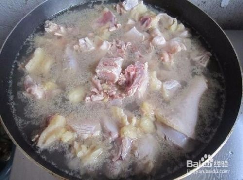 水中放入姜片、葱段,烧开水后,把鸡肉放入水中焯去血水。