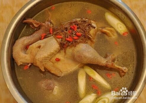 焯好的鸡肉洗干净血水备用。在砂锅或者炖锅中放入姜片、大枣、枸杞,倒入鸡肉,加冷水炖。