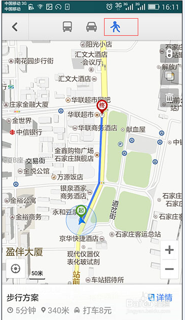 然后点击行人(蓝色小人)触屏键,就会发现起点与终点连点之间多了一条蓝色线段,这条线段就是你要走的大致路线。然后按照蓝色箭头的指引大步向前走就OK了。