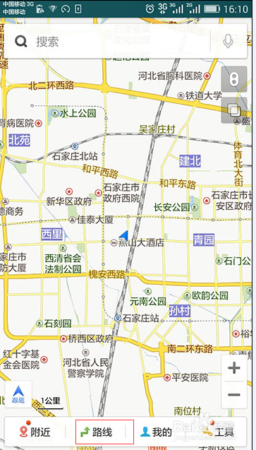 打开手机百度地图,就会显示你所在的位置,然后用手点击下面的【路线】。