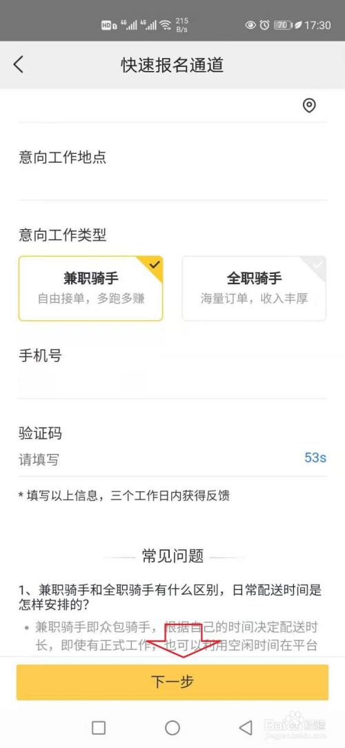 选择【工作类型】-【兼职骑手】,点击【下一步】提交信息等待审核。