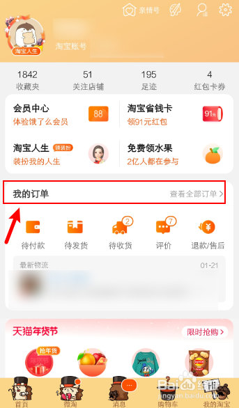 手机打开淘宝,在我的淘宝页面,点击“我的订单”。