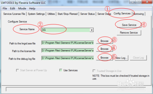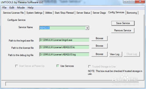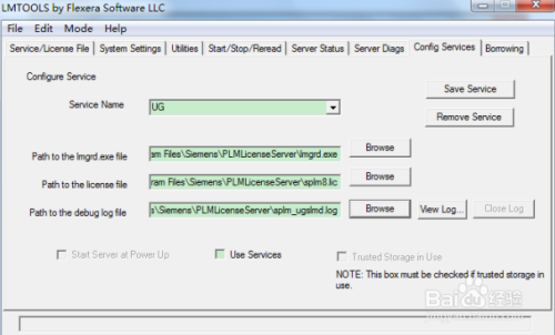 点击"Config Services ",(UG软件“Service Name”直接输入自定义名称,例如:“UG”;Abaqus软件“Service Name”直接输入自定义名称,例如:“Abaqus”,以用来区分)再点击”Browse"按钮,分别选取对应的文件,再点击“Save Service”,