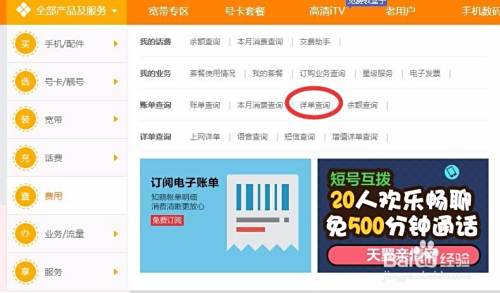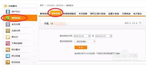 然后我们早中国电信官方网站的首页左边一栏中找到‘费用’旁边会有附加框跳出,选择账单查询下面的详单查询,你也可以直接选择下面有一个语音查询