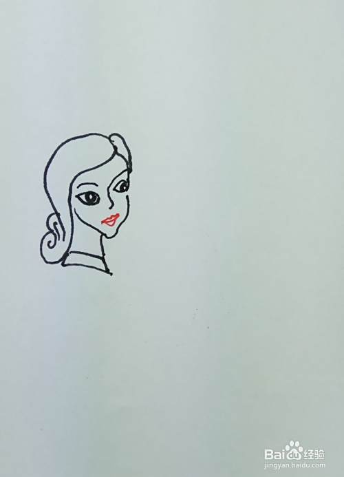 在白纸上用线条和曲线画出一个女孩的头部轮廓,并画出这个女孩的五官和卷发,然后画出她的脖子,这个女孩长得非常秀气。