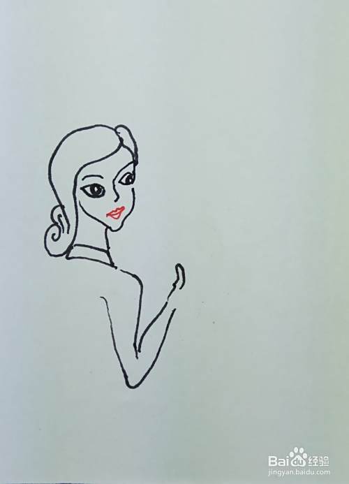 用线条和曲线画出这个女孩的肩膀部分和她右边的胳膊,她正向后看呢。