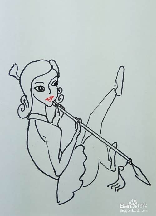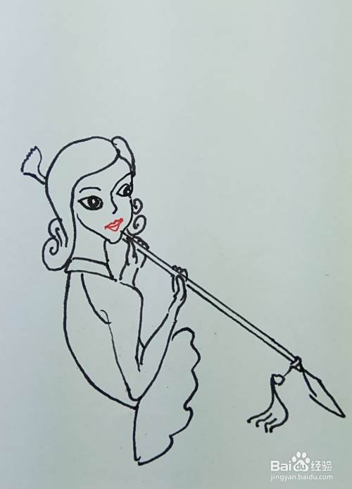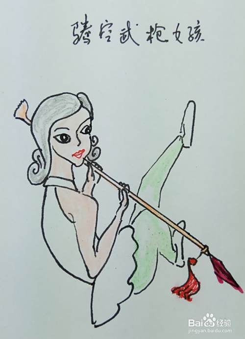 用水彩笔涂出她的皮肤色彩,涂出她身上穿着的衣服色彩,她的头发色彩,最后涂出她手里拿着的长枪色彩,修饰一下细节,简笔画就画好了。
