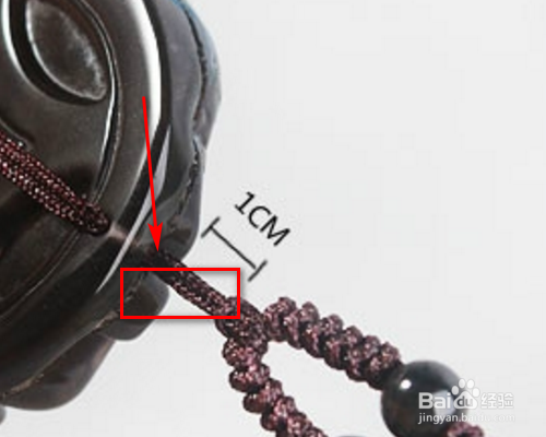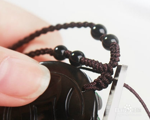 然后用打火机把剪完留下的那一点点线头烧一下,用手按一下,然后我们的吊坠就打完结了。