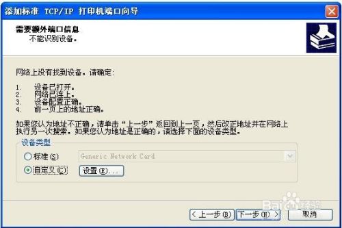 出现窗口“需要额外端口信息”。在“设备类型”中选择“自定义”,点击“设置”。