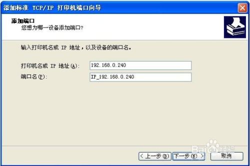 出现窗口“添加端口”,在窗口“添加端口”中的“打印机名称或IP 地址”栏输入“设置打印机的IP 地址”中记录的IP 地址。下图以IP 地址为“192.168.0.240”为例说明。IP 地址填写完成后,“端口名”栏会自动生成。点击“下一步”。