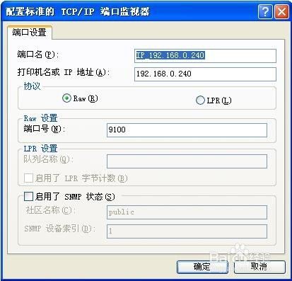出现窗口“端口设置”。确认“端口名”、“打印机名或IP 地址”的信息正确,“协议”为“Raw”及“端口号”为“9100”。点击“确定”。