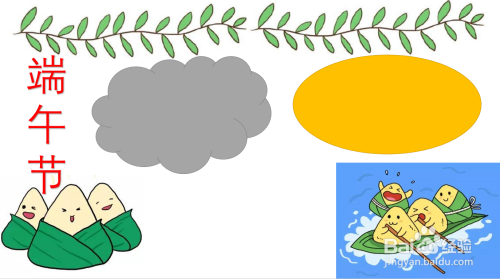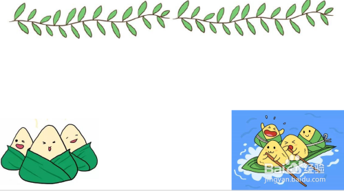 在画纸的左下方画上三个粽子的儿童画,在画纸的右下方画上一个粽子划龙舟的儿童画,画出的效果如图所示。
