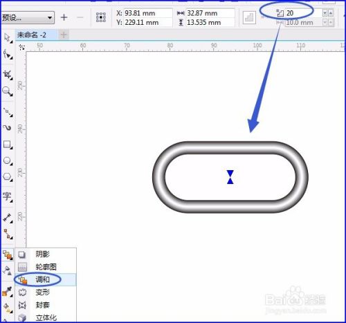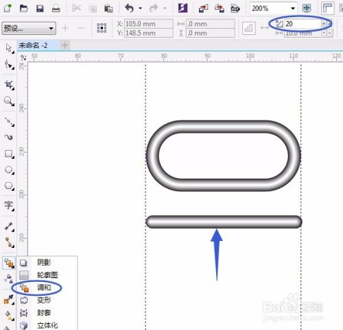 用“调和工具”进行调和,属性栏中数字默认20,如图所示: