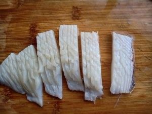 墨鱼去皮,这也比较容易,比较厚的皮,可以留着另外炒或者煮汤,去皮后的墨鱼洁白细嫩,另外鱼头就切成段备用