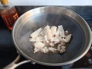 热锅,中火烧出香味,油的量要稍微多一点,倒入沥干的墨鱼翻炒,墨鱼继续打卷,一分钟内盛出,不要煮老了