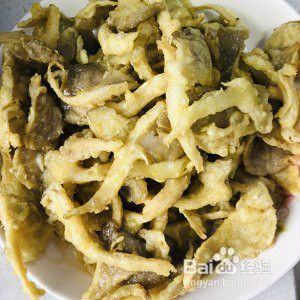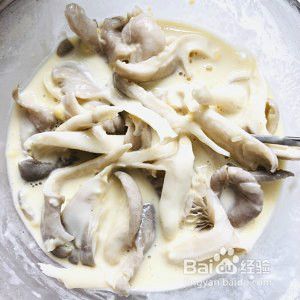 蘑菇倒进面糊中,翻拌均匀,每个蘑菇都沾上面糊。