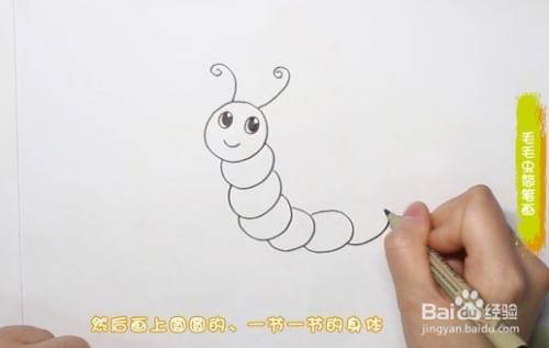 首先我们画出毛毛虫圆乎乎的脑袋,在脑袋上画上两只眼睛、嘴巴,头上绘出两个弯弯的触角,然后画上圆圆的、一节一节的身体。
