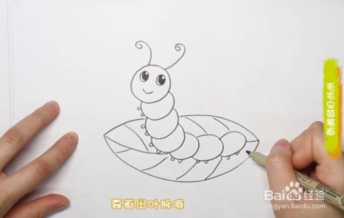 给毛毛虫的每一节身体都画上两只细细短短的小脚,接着在毛毛虫下面画上一片叶子,要把叶子的叶脉画出来哦。