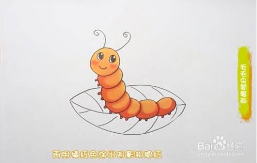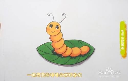 先画出一个圆乎乎的毛毛虫脑袋,然后画上它的眼睛和嘴巴,以及头上的两根触角,接着画出毛毛虫一节一节的身体,底下画上叶子。然后用橙色涂毛毛虫身体,绿色涂叶子,再画上阴影和腮红,一只可爱的毛毛虫就画好啦。