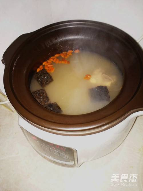 5时间还剩下最后的20分钟放入枸杞,继续盖上盖子直到汤煲好,然后加入适量的盐调味即可食用。