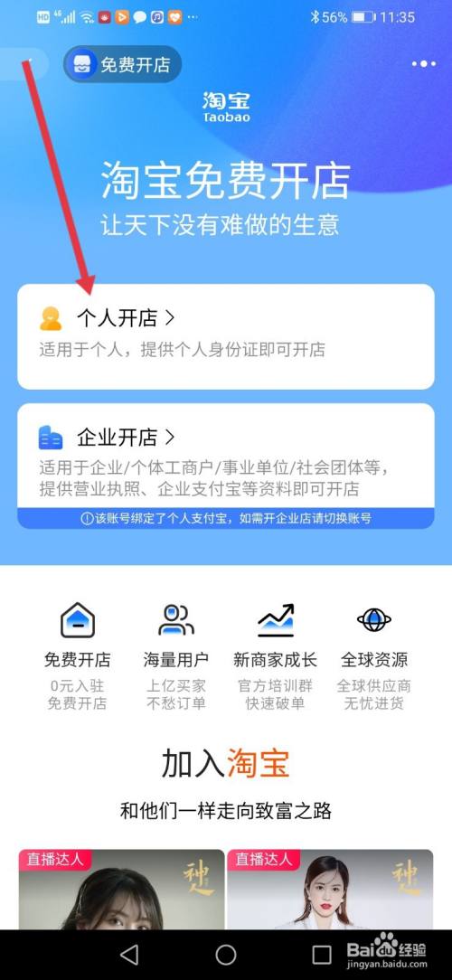 进入下面的页面,然后点击【个人开店】就可以下一步注册开店了。