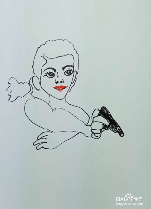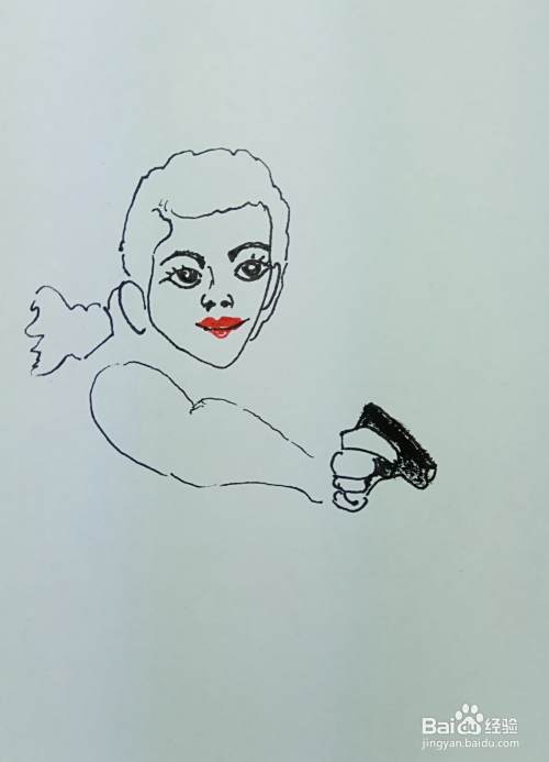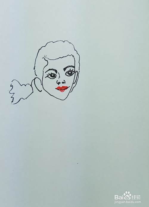 在白纸上用线条和曲线画出一个女人的头部轮廓,并画出她的五官和头发,然后用水彩笔涂出她的红嘴唇。