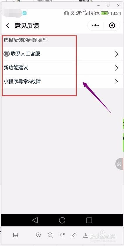 如下点击第2步窗口中的:意见反馈,进入如下页面内。按照提示可以看到此页面中会有:联系人工客服、新功能建议、小程序异常&故障,可根据所需点击其中一个进行下一步操作。