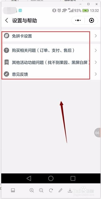 点击后来到如下窗口内,在此窗口中会看到相关的选项提示:免拼卡设置、购买相关问题(订单、支付、售后)、其他活动功能问题(找不到果园、黑屏白屏)、意见反馈,可根据提示分别点击并查看。