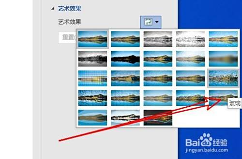在弹出的艺术效果下拉菜单中,我们找到玻璃的图标