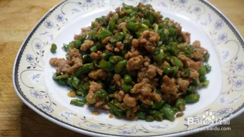 4、豆角断生加 肉末进去,炒匀出锅即可。