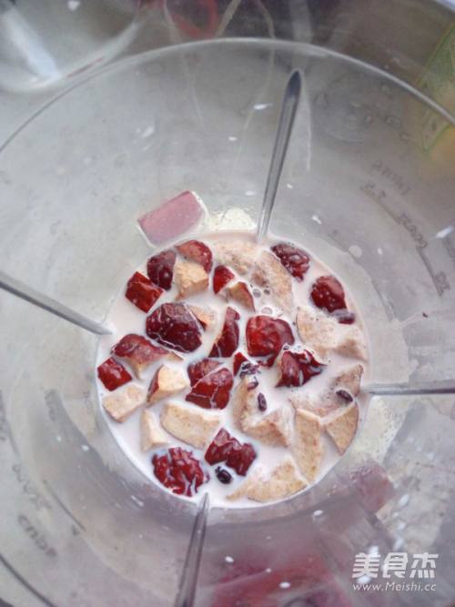 将煮好的黑米饭放在料理机,加入大枣丁和热牛奶打成糊