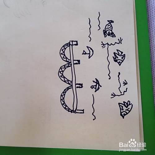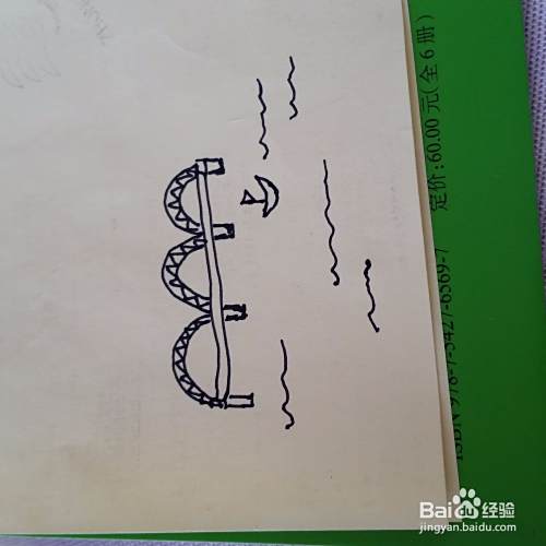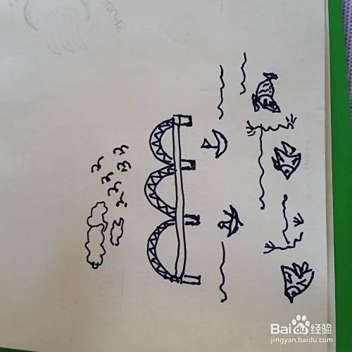 然后我们在水里画上一只小船,在小船上画上人和浆