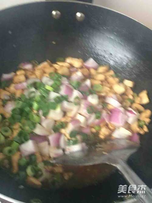 放入洋葱和葱花翻炒片刻加盐翻炒起锅
