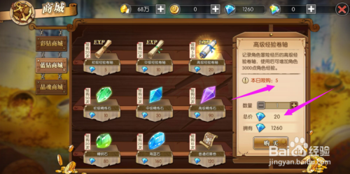 一天限购5次, 每次购买消耗20蓝水晶,如图。