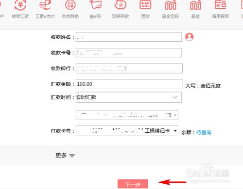 点击“转账汇款”,在框内依次输入:收款人的姓名,卡号,收款银行,金额。选择付款卡号,点击“下一步”。