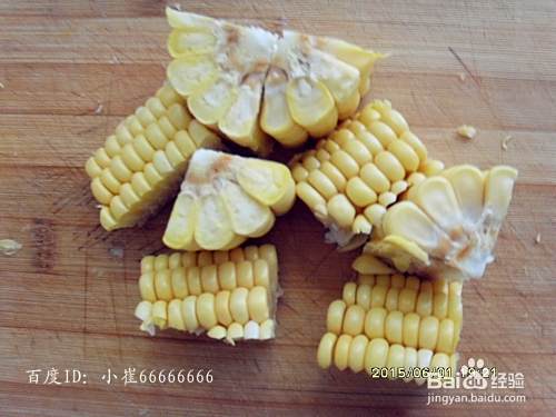 玉米先切成段,再剁成块,如图。玉米不是很好切,切的时候要小心哦!