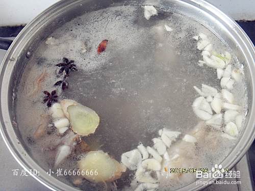 锅里的水开的时候,调入适量的十三香和少许盐。这步放盐是为了入味,不用放的太多,因为越炖会越咸。