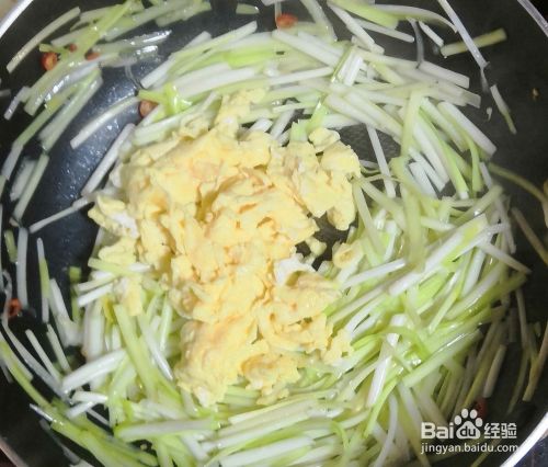 放入炒好的鸡蛋,倒入少许料酒和盐,翻炒均匀后关火盛出。