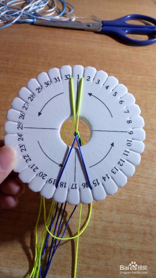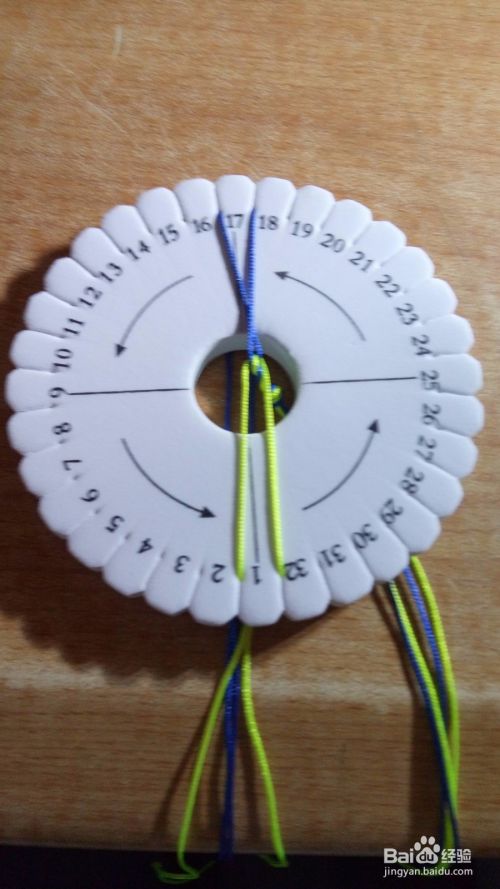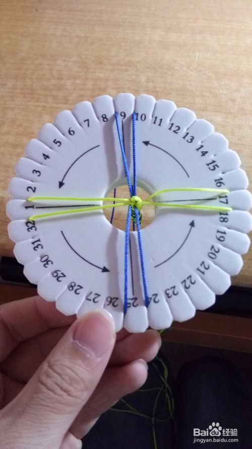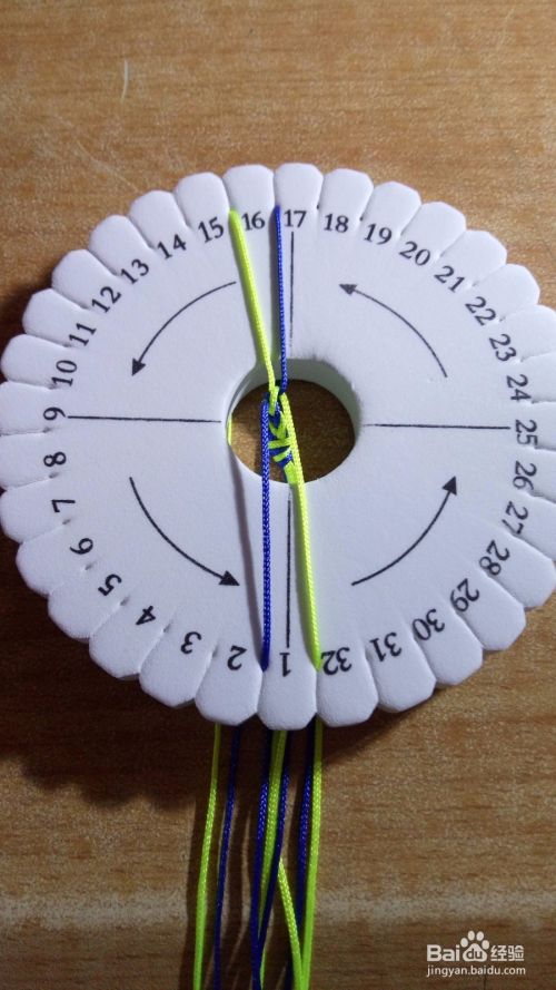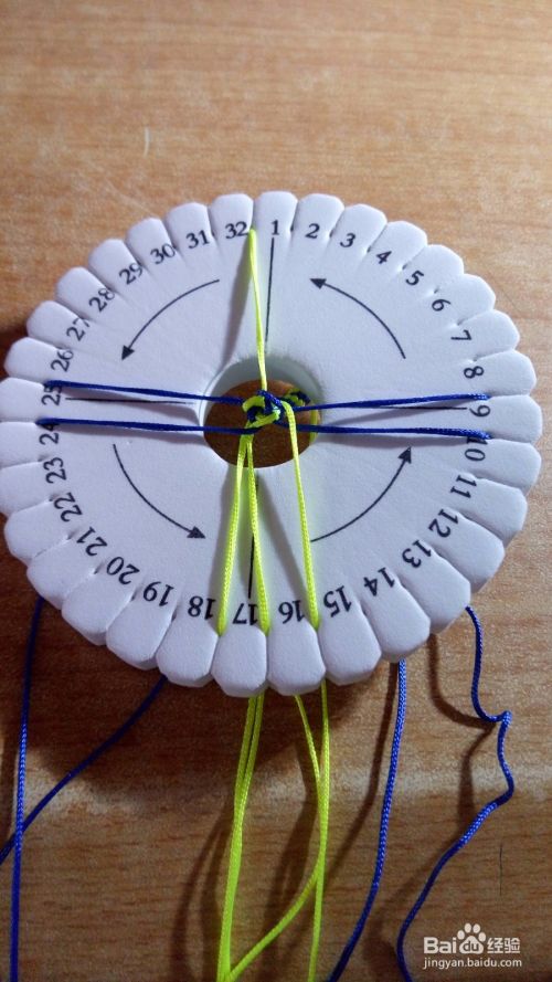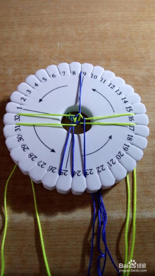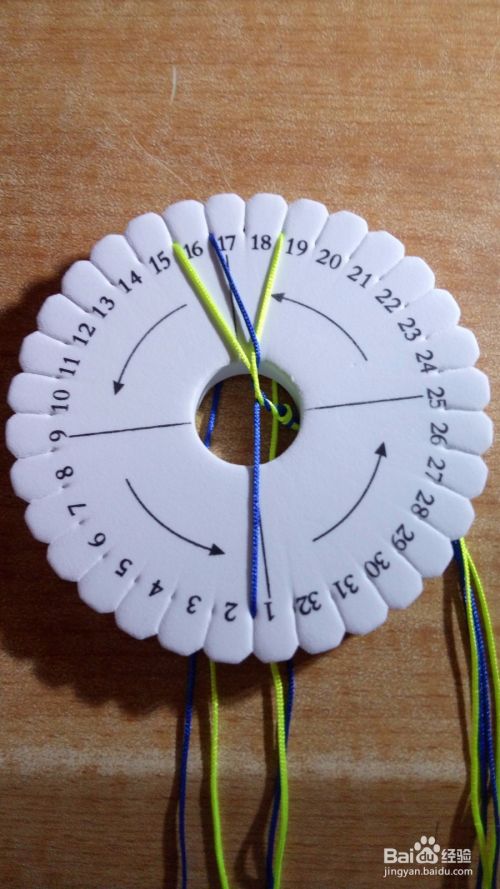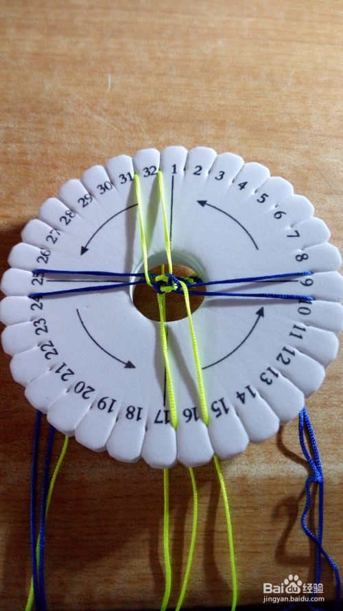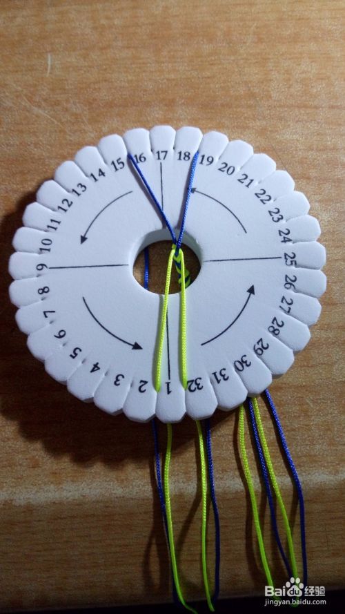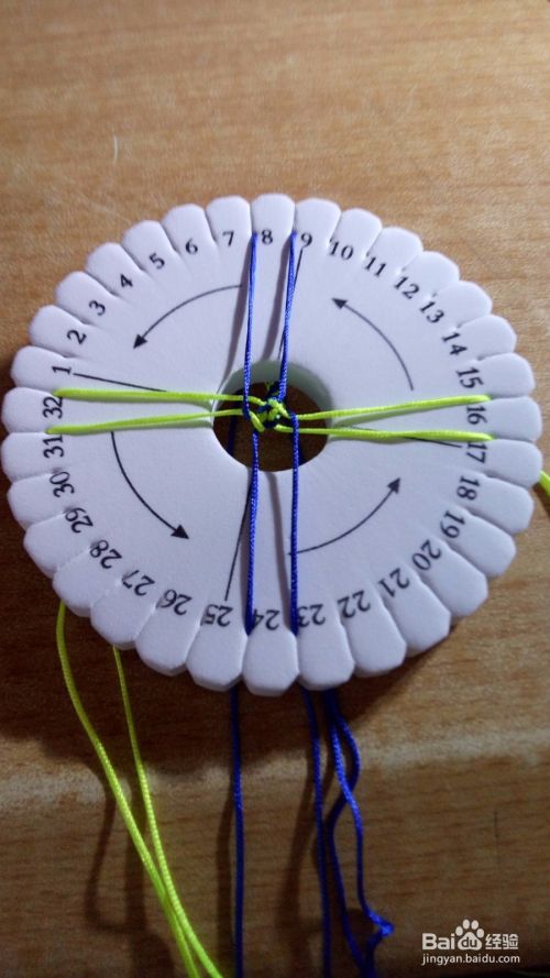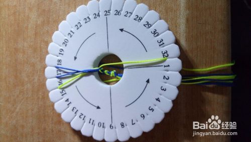 如图所示,将八根线两两分别卡在编织器上。从“2”处开始将两根线中右处的线卡在下方两根线的右侧,再将下方左侧的线卡在上方线的左边,呈逆时针方向重复操作。