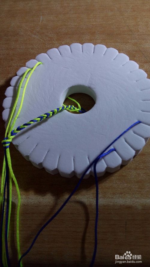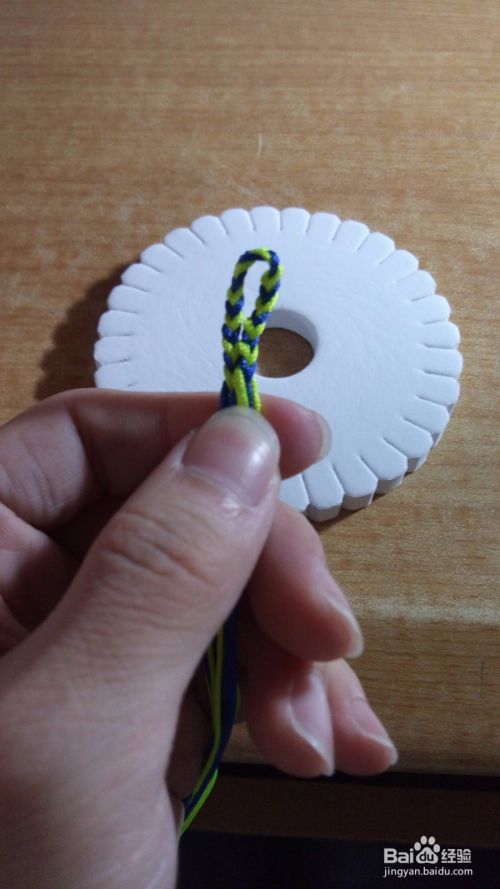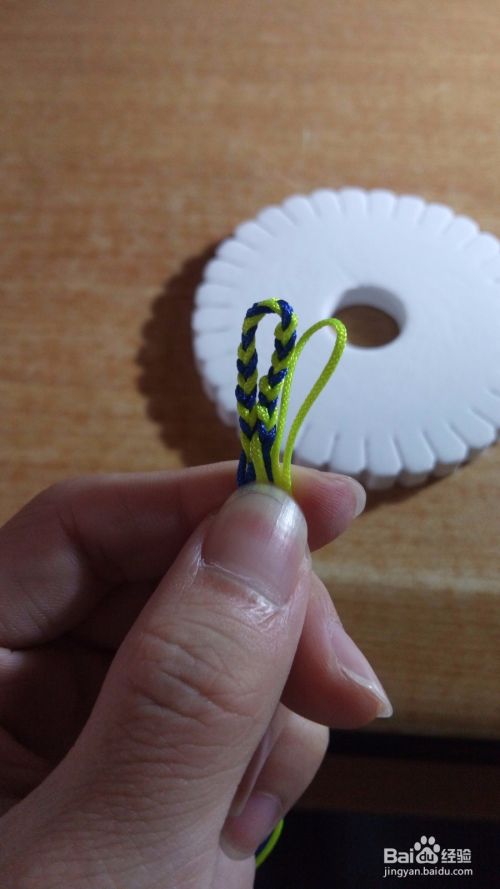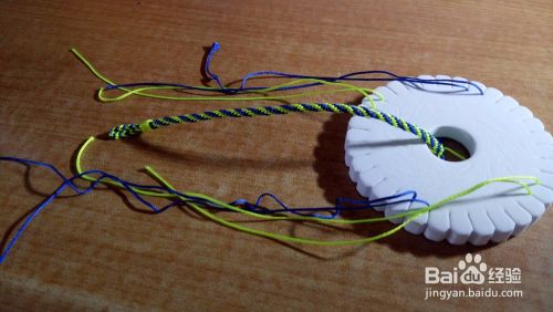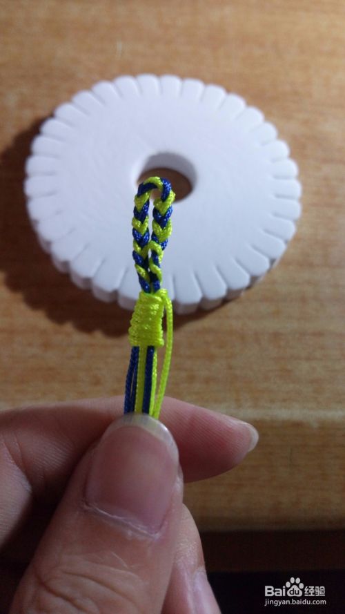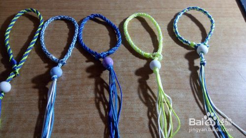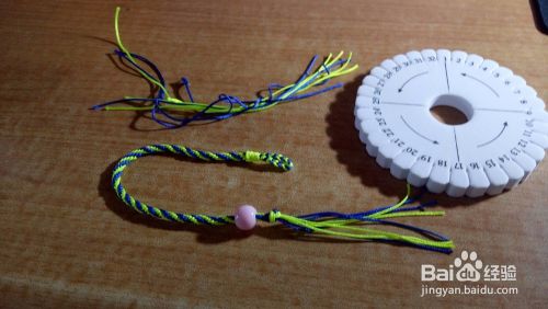 根据手腕的粗细,编到一定长度,取下来,打上一个结,将扣珠穿上去,最后将线头剪齐,用打火机稍微烧一下。